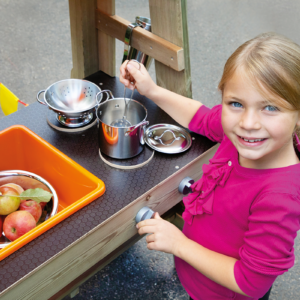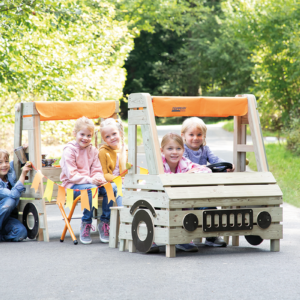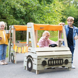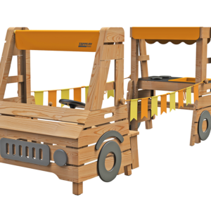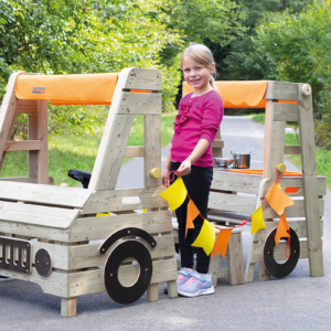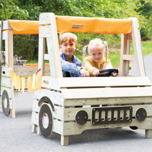 Das Camping Car bietet Kindern eine Möglichkeit für Rollenspiele in der Natur. Mehrere Kinder haben gleichzeitig die Möglichkeit dort zu spielen. Das Camping Car kann beliebig ausgestattet werden. Der zweiteilige Aufbau mit dem Fahrerhaus ist detailreich umgesetzt, inklusive Gas- und Bremspedal. Im hinteren Bereich erwartet die Kinder eine kleine Küche mit zwei Kochplatten und Waschbecken.
