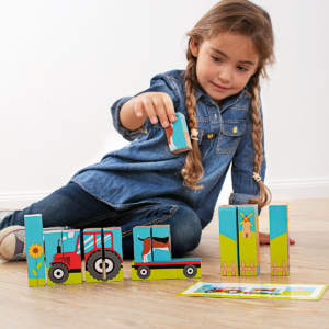 Nebeneinander, übereinander, durcheinander… hier ist Fantasie gefragt! Die vielseitigen Blockpuzzle-Elemente können beliebig miteinander kombiniert werden. Zehn spannende Vorlagen bieten den Kindern die Möglichkeit interessante Bauernhofwelten aufzubauen.