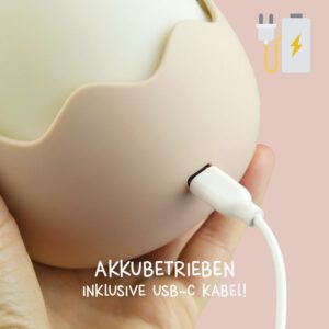 Der integrierte Akku wird bequem über das mitgelieferte USB-C-Ladekabel geladen und ist in etwa 4,5 Stunden vollständig aufgeladen. Danach begleitet das kleine Küken Kinder zuverlässig durch die Nacht.