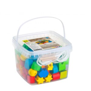 Eine Vielzahl von Fädelmöglichkeiten bietet dieses Lernspiel. Die Zuordnung von Form und Farbe steht hier im Vordergrund. Die mitgelieferte Anleitung zeigt Möglichkeiten zum Fädeln.