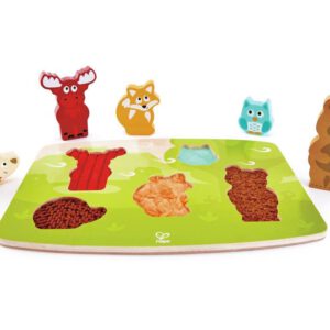 Möchtest du einen Elch knuddeln? Nimm die Teile aus dem Puzzle heraus und fühle das Fell von Elch, Eule, Igel, Fuchs und Bär.
