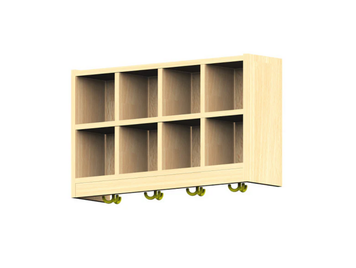 Für Jacken, Rucksäcke und Turnbeutel ist jeder Platz mit einem stabilen Dreifachhaken ausgestattet. Die offene Gestaltung ohne Türen sorgt für schnellen Zugriff und Übersichtlichkeit.