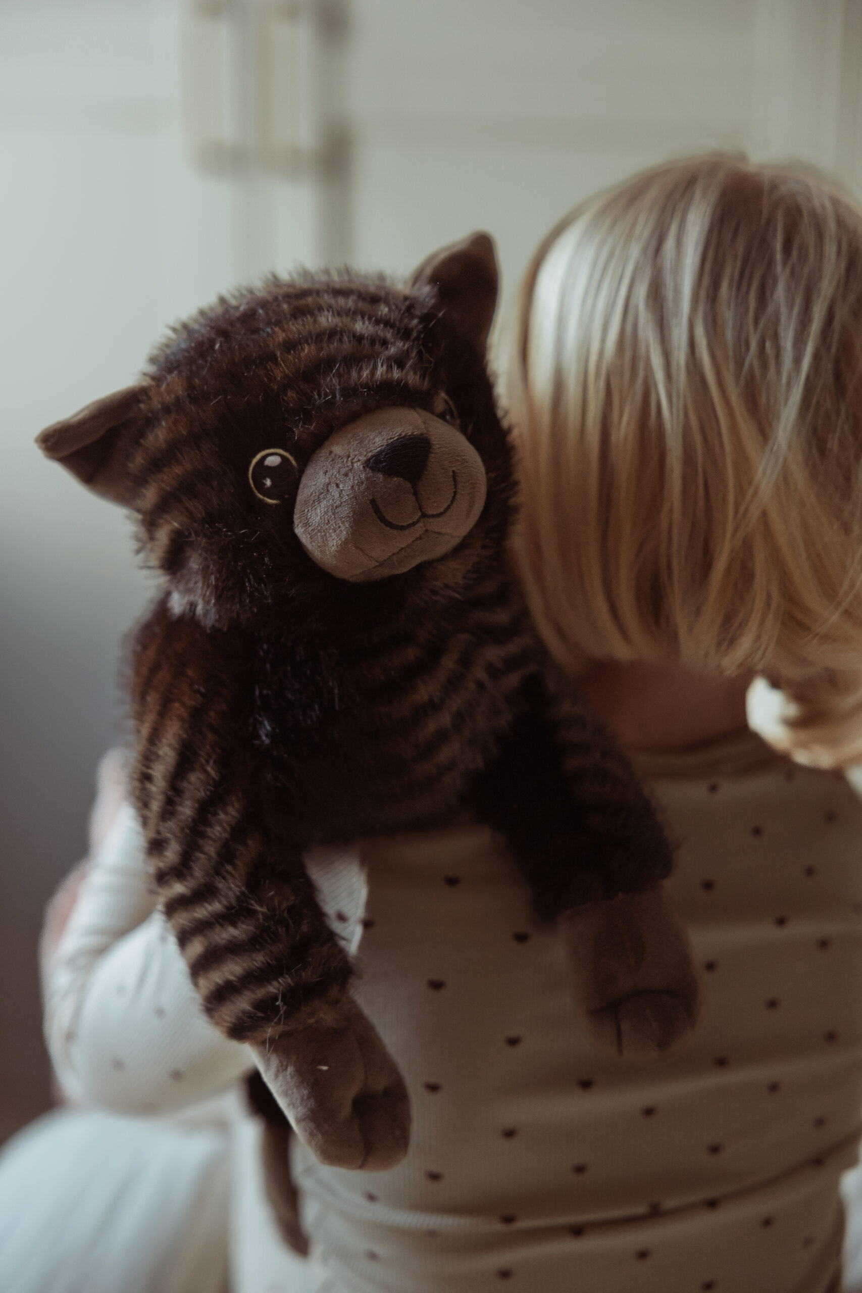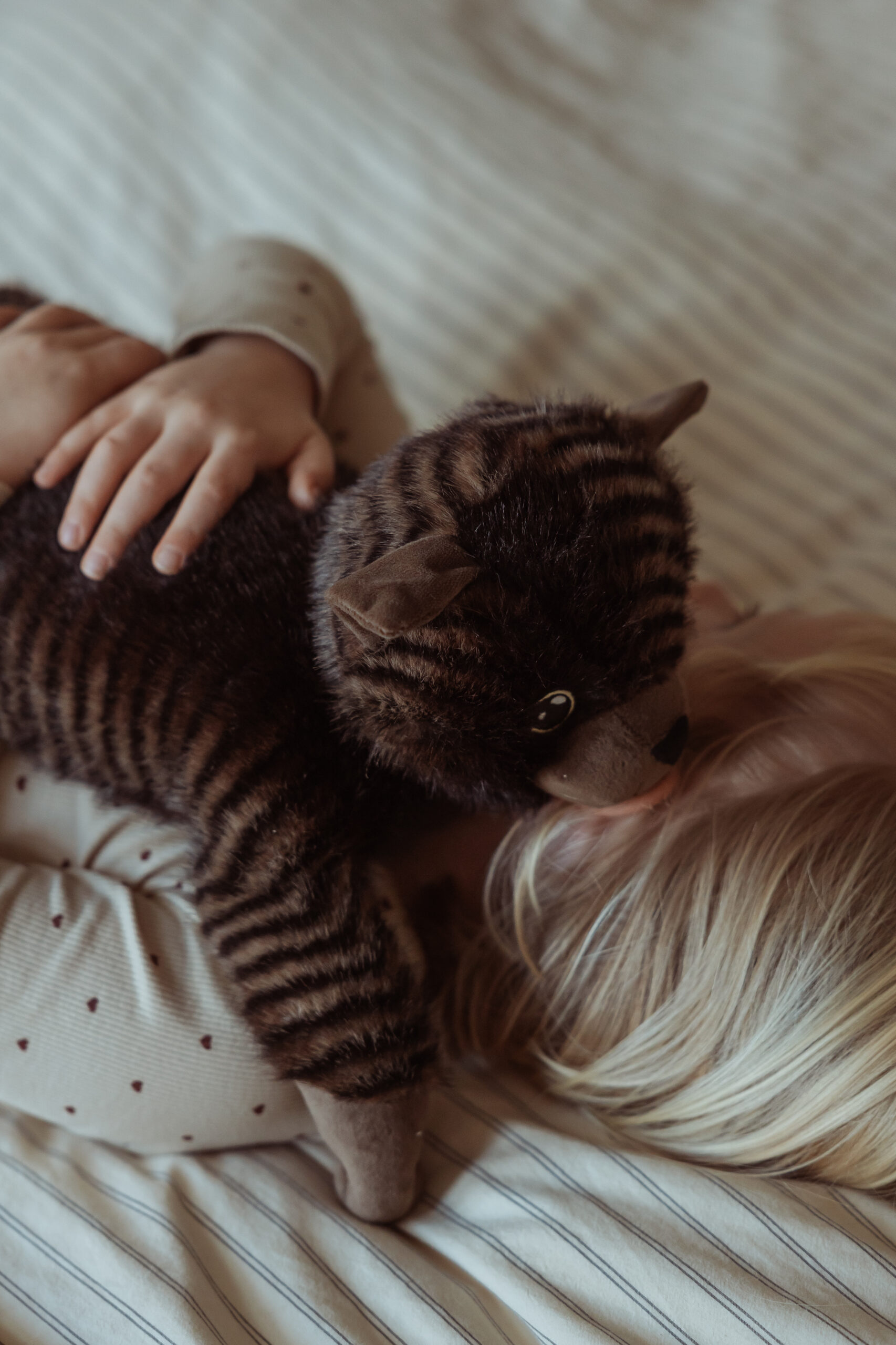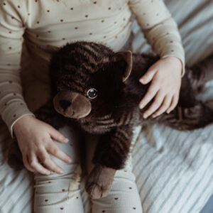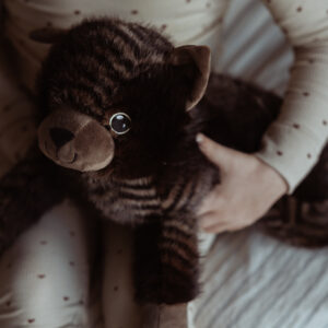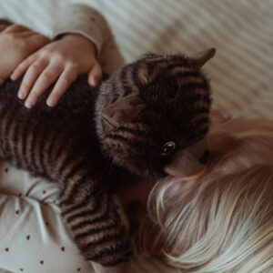 Mit ihrem weichen schwarz/braunen Fell und den faszinierenden Streifen ist diese Katze mehr als nur ein Kuscheltier – sie ist ein therapeutischer Begleiter, der Trost und Ruhe spendet. Die beruhigende Präsenz dieser weichen Katze hilft Kindern, sich zu entspannen, und schafft eine entspannte Atmosphäre, egal ob sie auf ihrem Schoß, ihrer Brust oder einfach nur an ihrer Seite liegt.