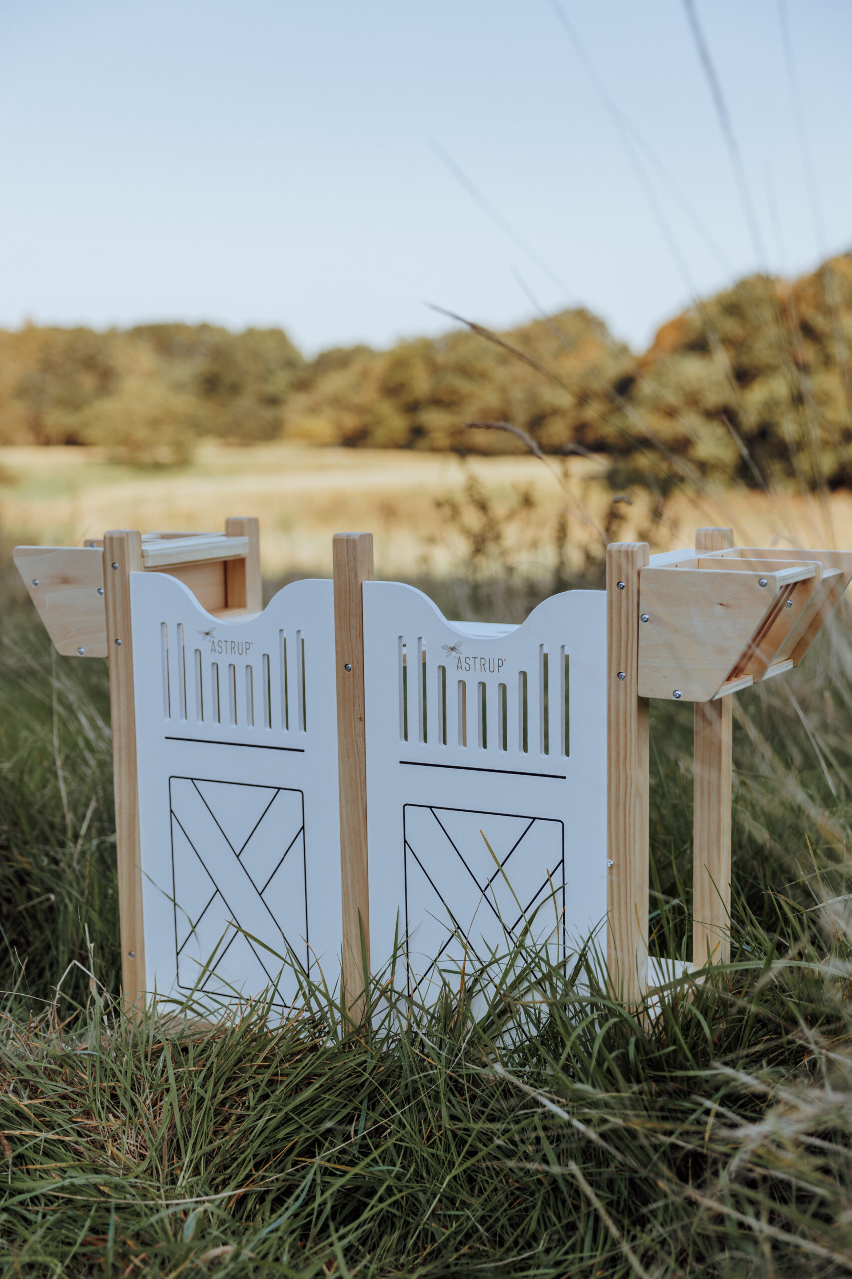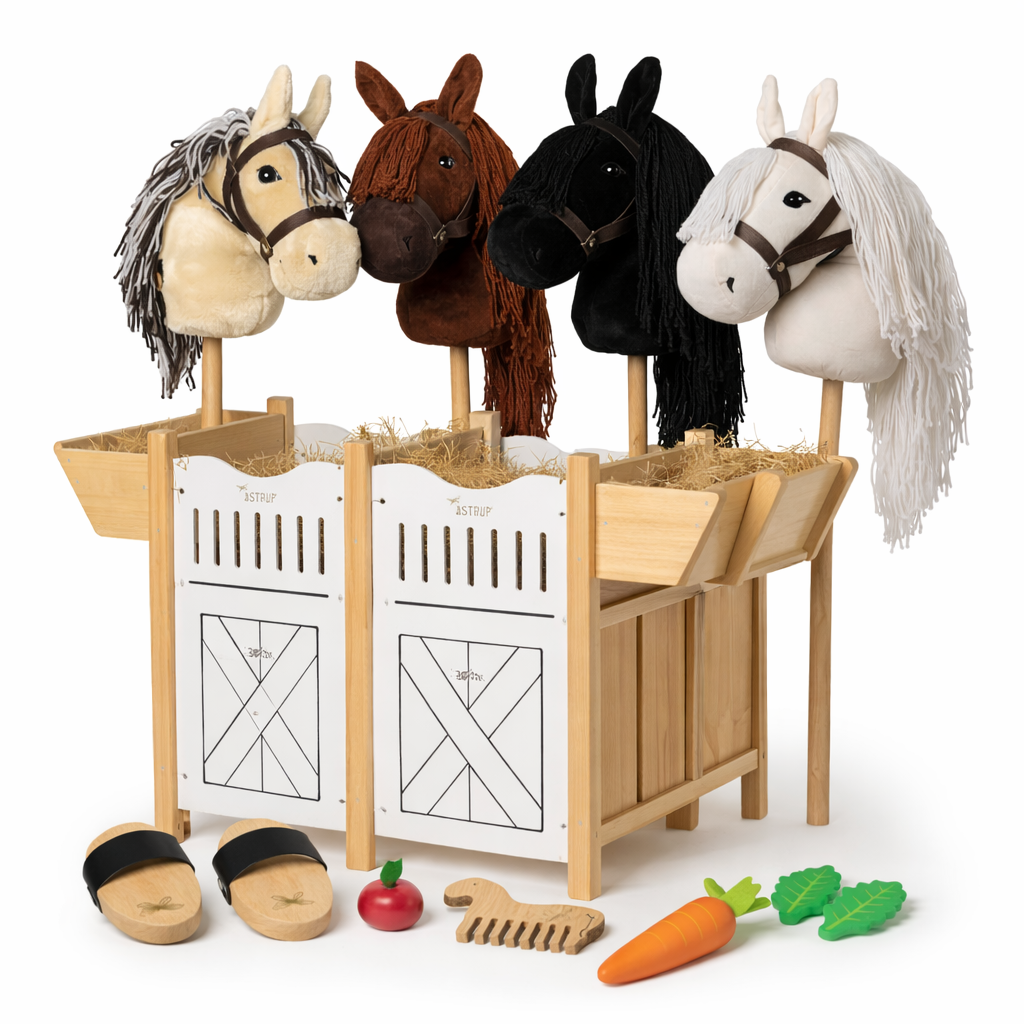 Das Hobby Horsing Starter Set von byASTRUP® bietet Kitas und pädagogischen Einrichtungen einen idealen Einstieg in die Welt des Steckenpferde-Spiels. Das Set vereint alles, was Kinder für aktives, kreatives und gemeinschaftliches Spiel benötigen: einen Stall für vier Steckenpferde, vier Pferde in den Farben Blond, Braun, Schwarz und Weiß sowie das 8-teilige Pflege-Set mit Striegel, Bürste, Kamm und Futterzubehör.