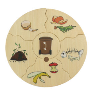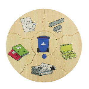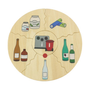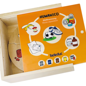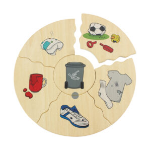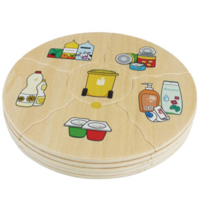 Jeweils fünf Puzzleteile passen rund um die entsprechende Mülltonne. Die Kontur der Teile ermöglicht den Kindern die leichte Selbstkontrolle. Mit Holzbox zum Verstauen in der bewährten HUMANICO Box Qualität.