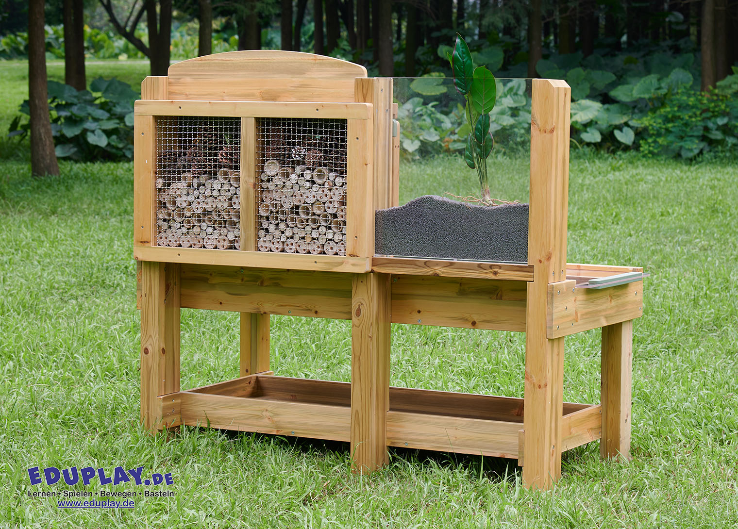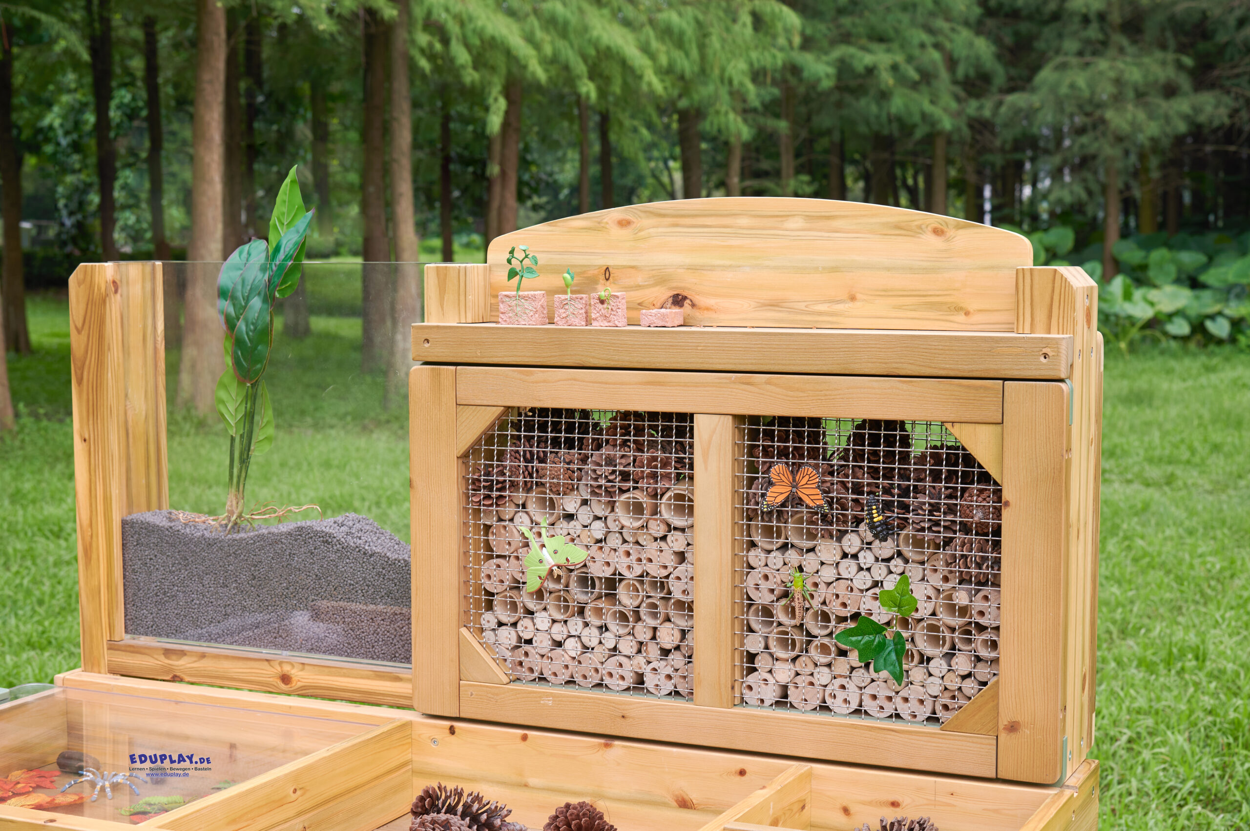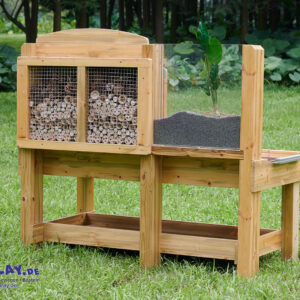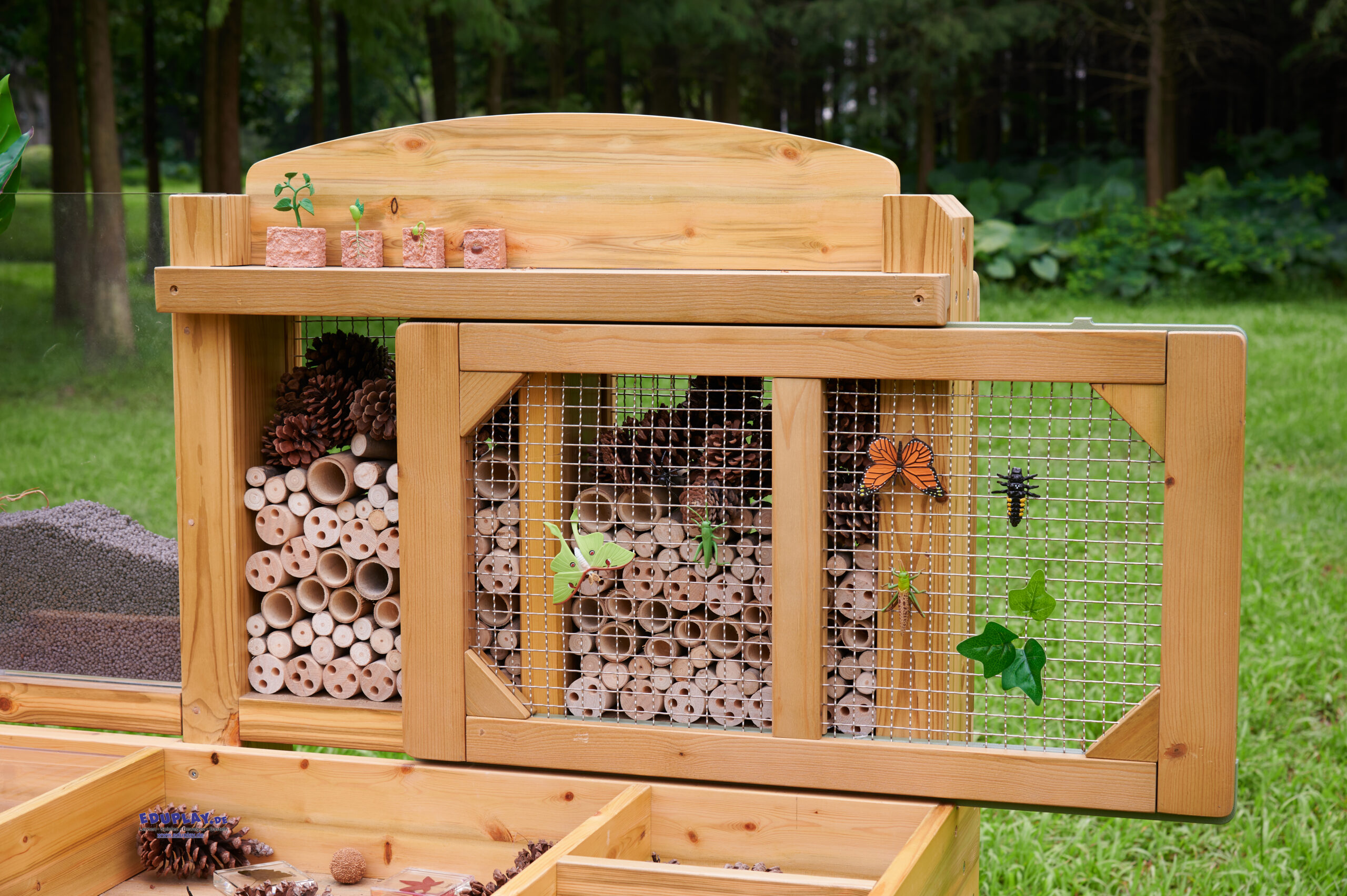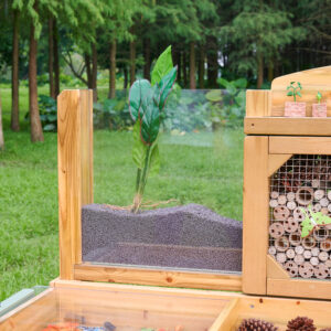 … bietet jede Menge Möglichkeiten, um Lebewesen zu beobachten, und lockt Wildtiere in deinen Garten. Die Sitzfläche ist in verschiedene Bereiche für Sammlungen unterteilt. Kleine Bereiche für Rindenstücke, Holzspäne, größere Bereiche für morsches Holz aus dem Wald, Blätter und so weiter. Es gibt durchsichtige Sammelschalen, die den Prozess erleichtern und herausgenommen und wieder eingesetzt werden können, wenn sie voll sind. Ein großes Fach mit durchsichtigem Deckel dient zur Aufbewahrung und Beobachtung interessanter oder lebender Exemplare. Es ist faszinierend, eine Schnecke unter der durchsichtigen Acrylplatte zu beobachten. Auf der Rückseite der Bank (hinter einem Edelstahlgitter) befindet sich ein offener Bereich mit löchrigen Holzröhren, die alle Arten von Insekten anziehen. Außerdem gibt’s einen durchsichtigen, vertikalen Plexiglasbehälter, in dem man Pflanzen oder Gemüse ziehen oder als Wurmkompost verwenden kann. Es ist faszinierend, Wurzeln oder Pflanzen wachsen zu sehen oder die Bewegung der Würmer zu beobachten, wenn sie sich eingraben.