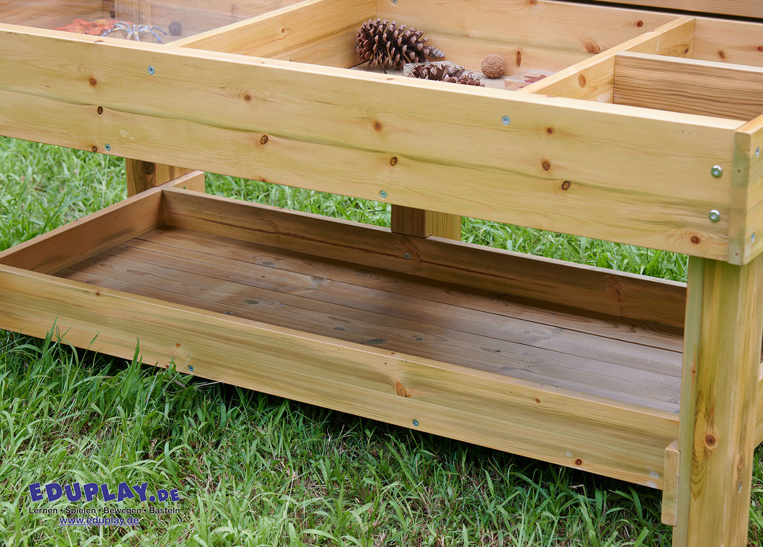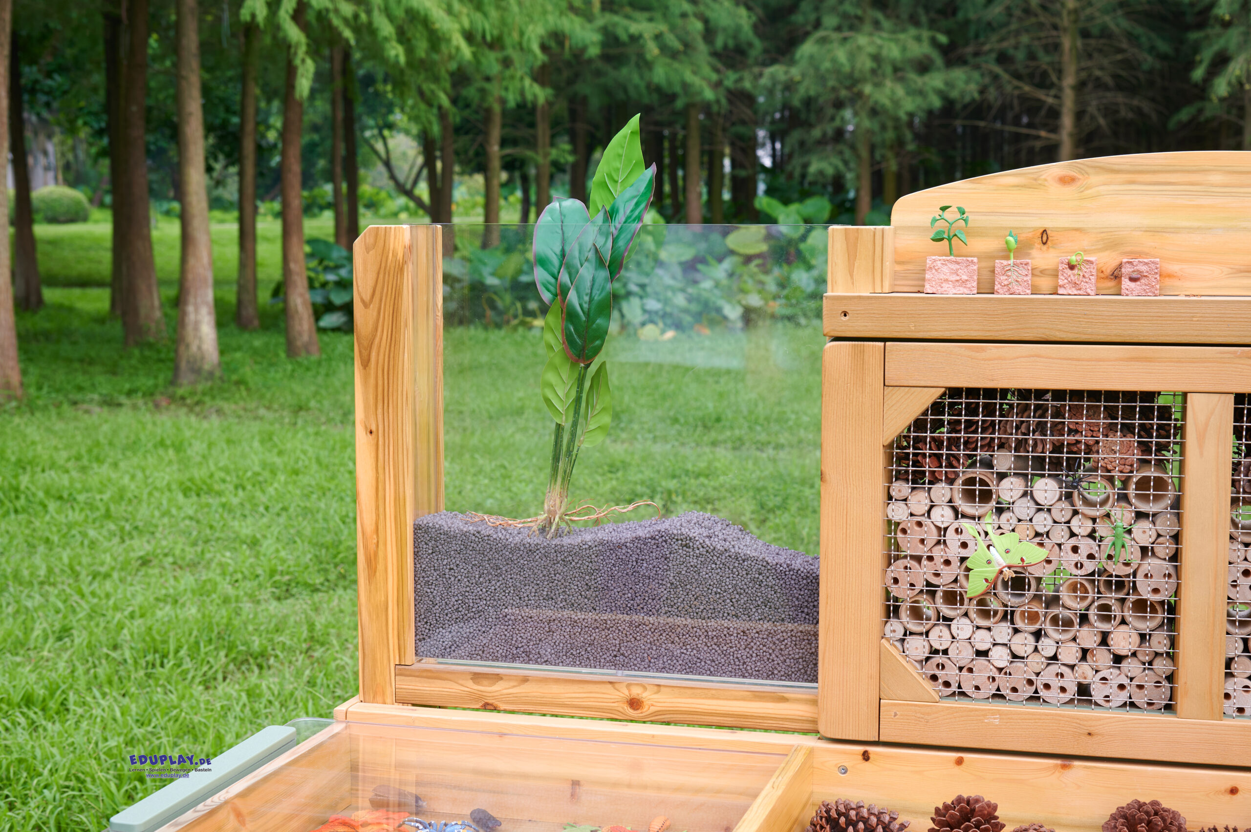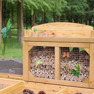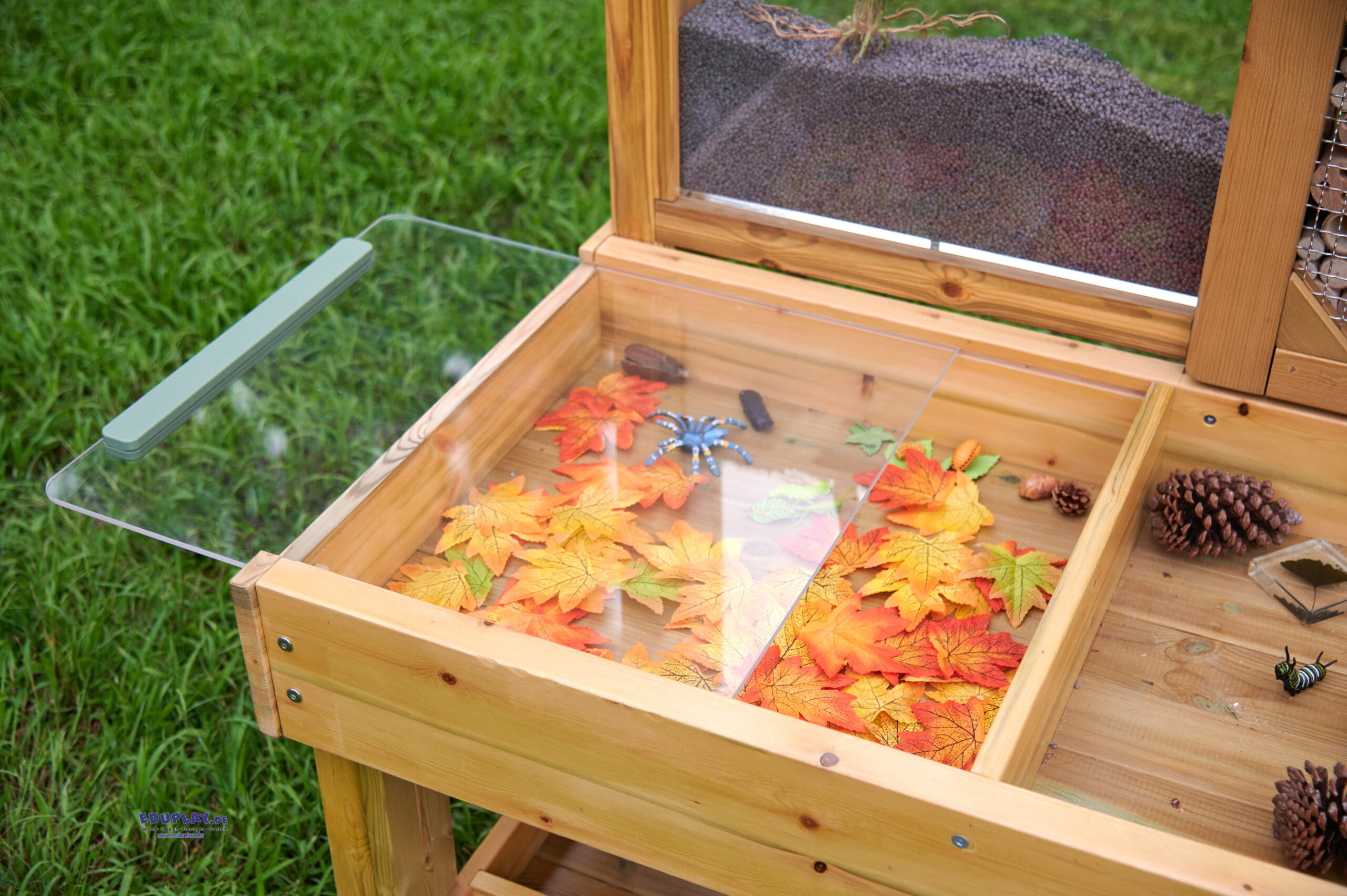 … bietet jede Menge Möglichkeiten, um Lebewesen zu beobachten, und lockt Wildtiere in deinen Garten. Die Sitzfläche ist in verschiedene Bereiche für Sammlungen unterteilt. Kleine Bereiche für Rindenstücke, Holzspäne, größere Bereiche für morsches Holz aus dem Wald, Blätter und so weiter. Es gibt durchsichtige Sammelschalen, die den Prozess erleichtern und herausgenommen und wieder eingesetzt werden können, wenn sie voll sind. Ein großes Fach mit durchsichtigem Deckel dient zur Aufbewahrung und Beobachtung interessanter oder lebender Exemplare. Es ist faszinierend, eine Schnecke unter der durchsichtigen Acrylplatte zu beobachten. Auf der Rückseite der Bank (hinter einem Edelstahlgitter) befindet sich ein offener Bereich mit löchrigen Holzröhren, die alle Arten von Insekten anziehen. Außerdem gibt’s einen durchsichtigen, vertikalen Plexiglasbehälter, in dem man Pflanzen oder Gemüse ziehen oder als Wurmkompost verwenden kann. Es ist faszinierend, Wurzeln oder Pflanzen wachsen zu sehen oder die Bewegung der Würmer zu beobachten, wenn sie sich eingraben.