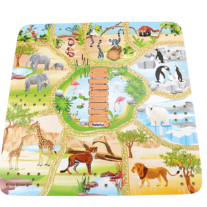 Dieses Kooperationsspiel fordert die Kinder dazu auf, gemeinsam zu überlegen welche Tiere gefüttert werden sollen und wie die Wegplatten richtig angeordnet werden.