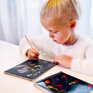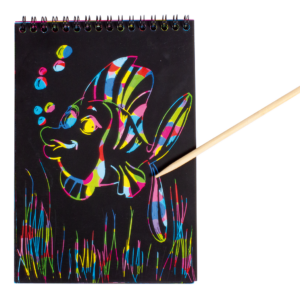 Hinter jedem schwarzen Blatt versteckt sich eine versteckte Regenbogenschicht, die man durch Freikratzen zu Gesicht bekommt. So können Kinder großartige Kunstwerke in Regenbogenfarben kratzen. Eine tolle Geschenkidee. Die Kinder lieben es! Einfach loskratzen und kreativ werden.