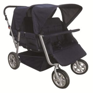 Zusammenfaltbarer Krippenwagen für 4 Kinder. Passt in jeden großen Kofferraum. Die Räder bestehen aus EVA und haben eine Größe von Ø 25 cm vorne und Ø 29 cm hinten. Zudem sind die Vorderräder um 360° schwenkbar. Der Bezug besteht aus 100% Polyester und ist abnehmbar. Dieser Krippenwagen verfügt über eine Sicherheitsfuß- und Handbremse. Beide mit Feststellfunktion. Das Sonnendach ist in mehrere Positionen verstellbar und kann auch ganz entfernt werden. Jeder Sitz verfügt über einen 5-Punkt-Sicherheitsgurt. Die Rückenlehne sowie die Fußablage sind verstellbar. L/B/H 127*84*100 (40 cm geklappt)