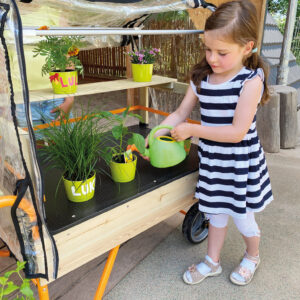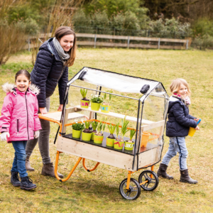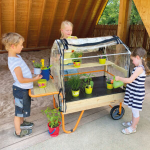 Ein großartiges Instrument, um Kinder zu nachhaltigem und ökologischem Denken zu erziehen. Kinder lernen alles über die Aufzucht der Pflanze vom Samenkorn bis zur fertigen Pflanze. Das mobile Gewächshaus kann in die Sonne oder in den Schatten gerollt werden, je nach Wetterlage. Mit aufklappbarer, transparenter Oberseite, die mit einem Reißverschluss leicht geöffnet und geschlossen werden kann.
