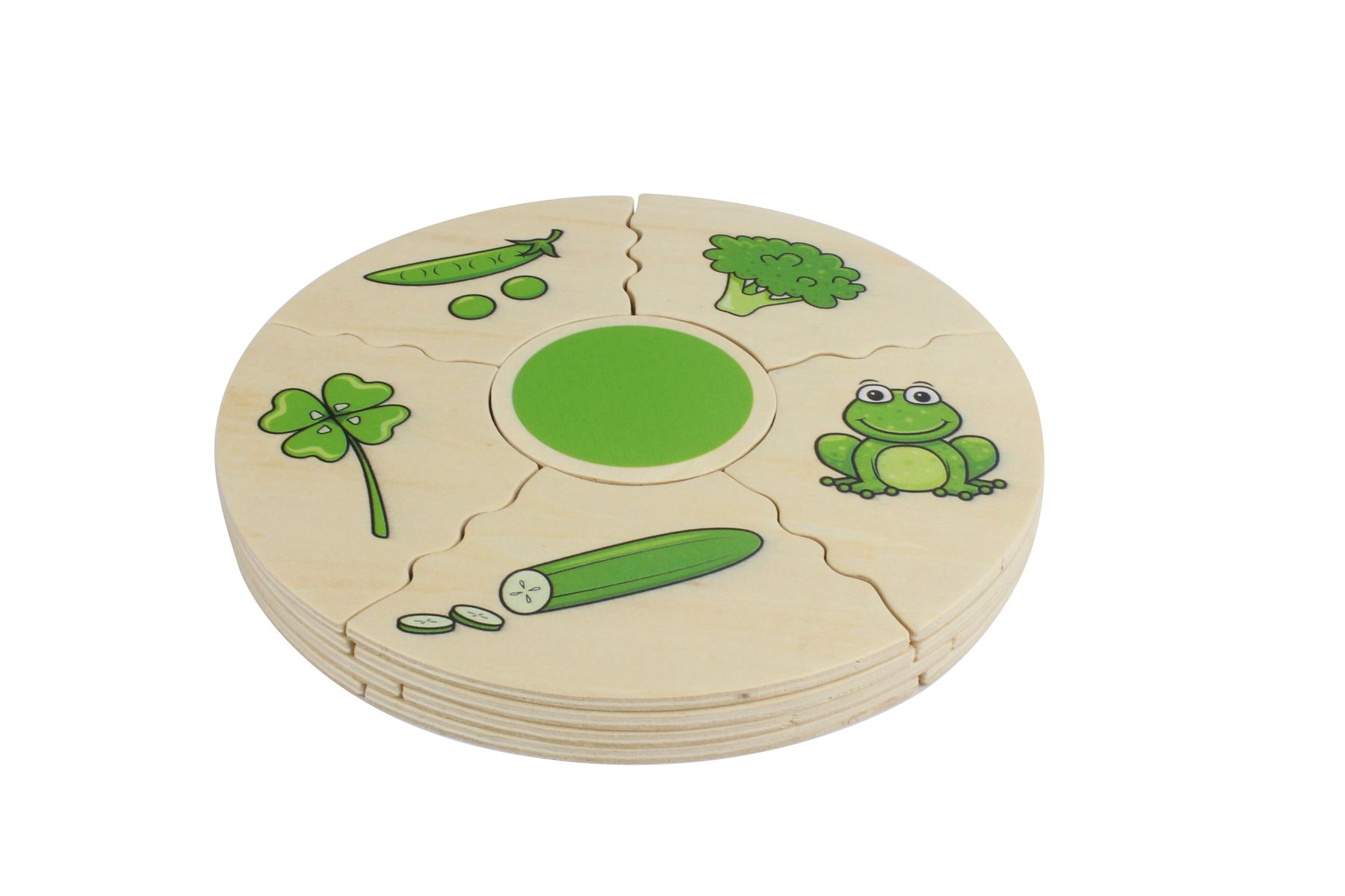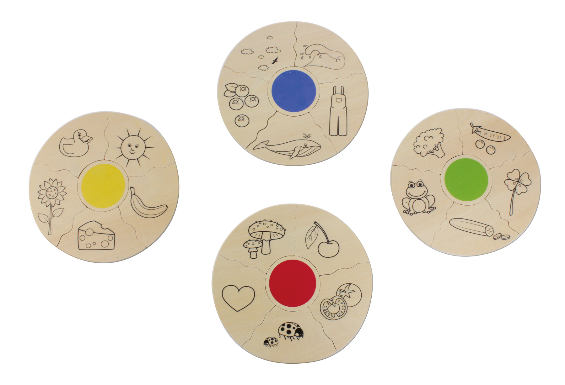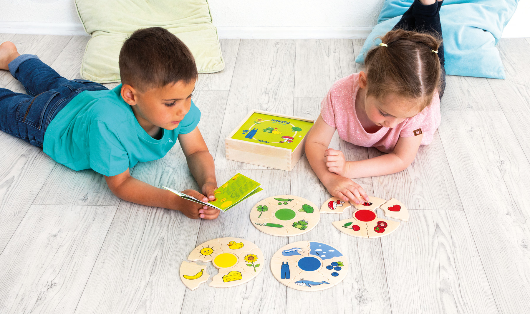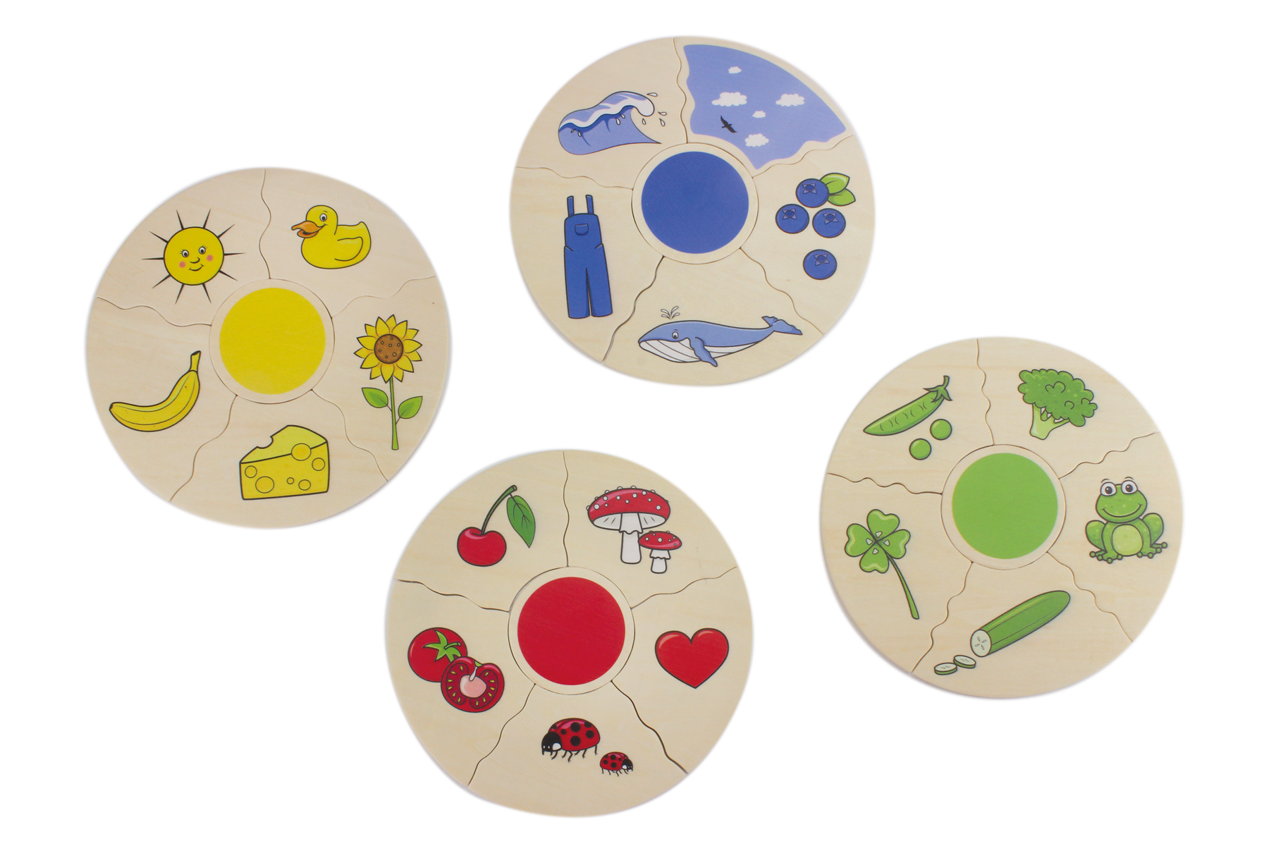Mit diesem Puzzle lernen Kinder die vier Grundfarben Rot, Blau, Gelb und Grün kennen und benennen. Sie entdecken, welche Farben in der Natur und in ihrer Umgebung vorkommen. Welche Farbe haben Früchte, Gemüse, Tiere, Pflanzen oder Kleidung? Wie sieht der Himmel, das Meer oder die Wiese aus? Es gilt, alle Teile der richtigen Farbe zuzuordnen.