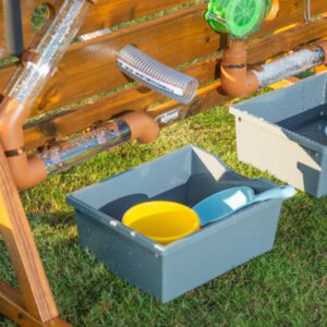 Die 2 grauen Wasser-Auffangbehälter sind in der Lieferung enthalten. Zusätzlich sind 2 Eimer, 2 Schöpfkellen, 1 Schiffchen und 12 Bälle gratis im Set dabei, sodass der Wasserspaß direkt starten kann. Der blaue Behälter (seitlich) ist nicht enthalten.