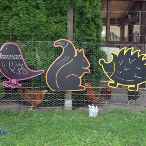 Eichhörnchen, Vogel und Igel haben vorgebohrte Löcher und können ganz einfach mit beiliegenden Kabelbindern an einem Gartenzaun befestigt werden. Indoor ist die Befestigung mit doppelseitigem Klebeband oder Schrauben möglich. Die Tafelfläche kann mit Tafel- oder Flüssigkreide bemalt werden (nicht für Straßenkreide geeignet).