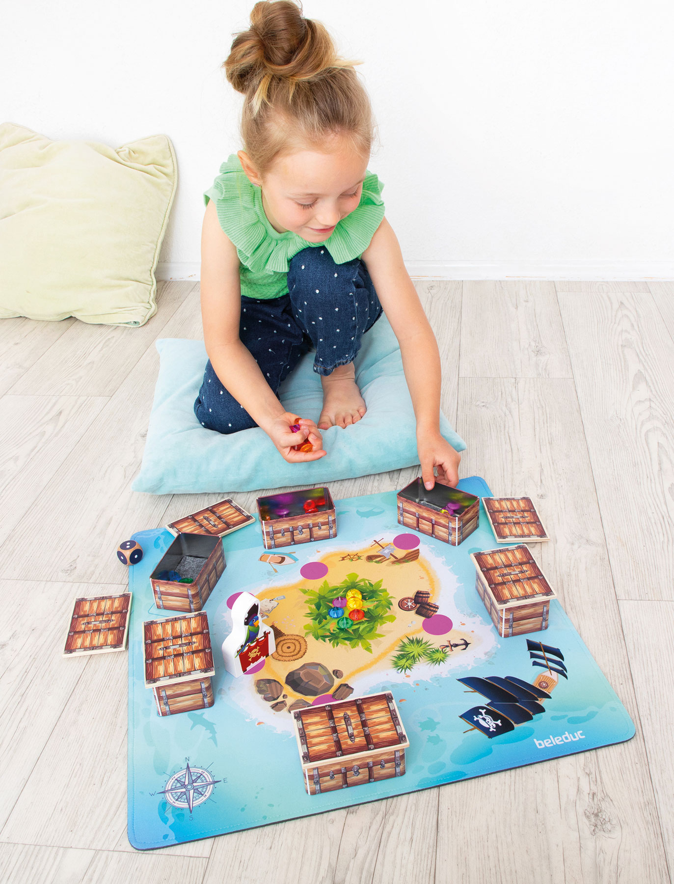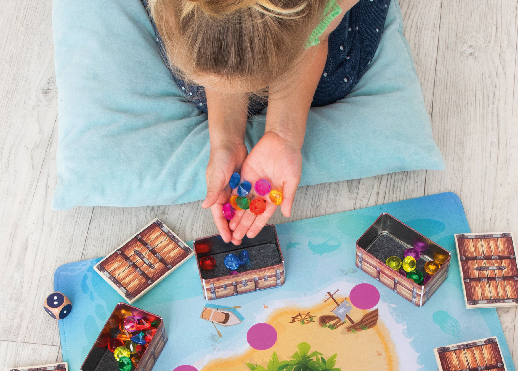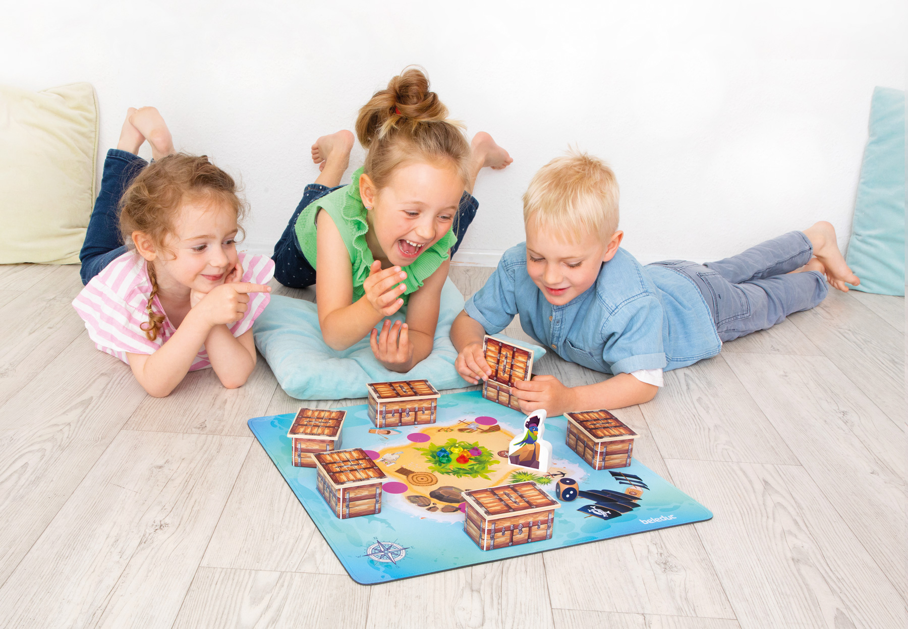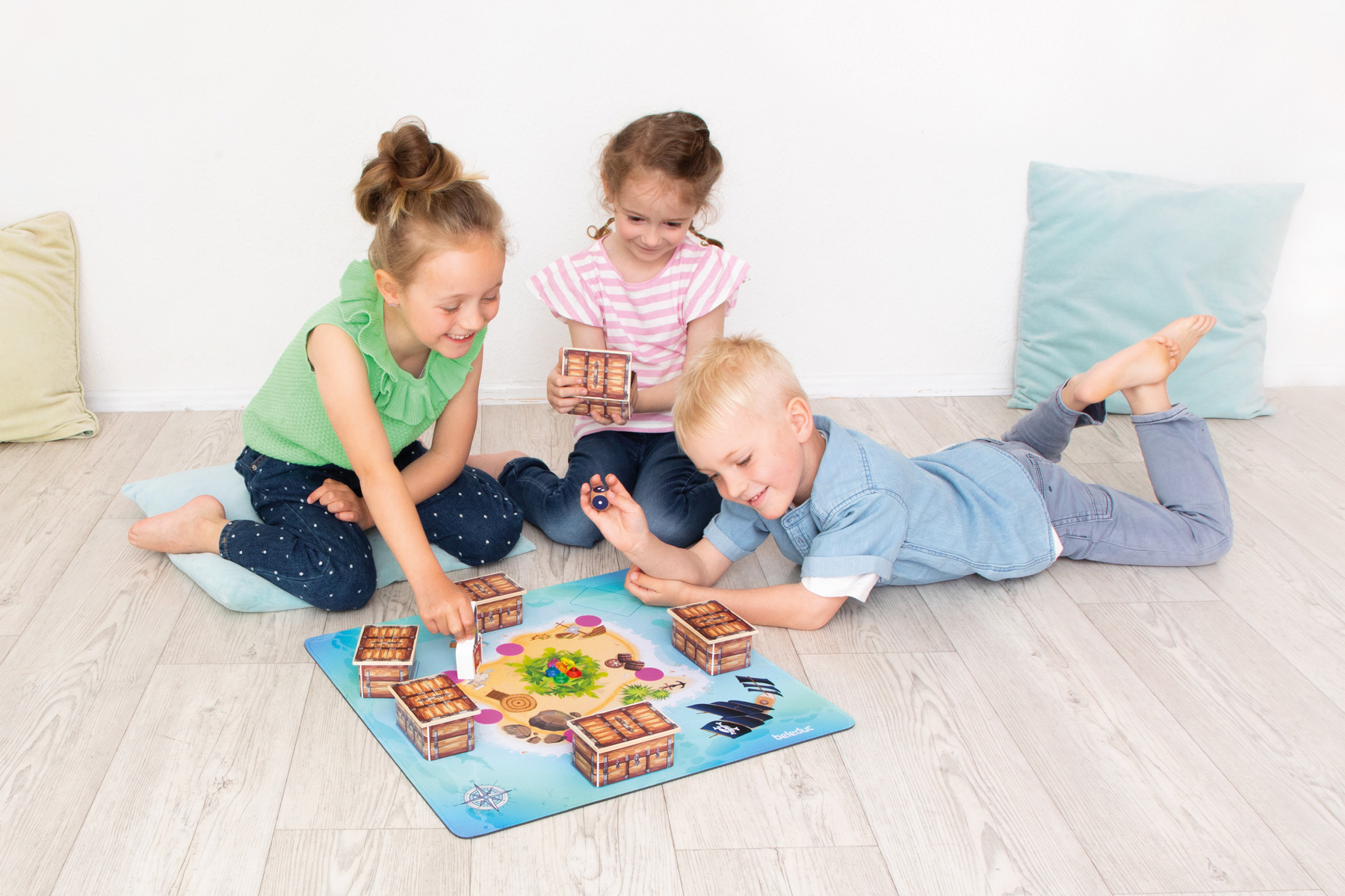 Auf zur Schatzinsel! Wer sich am besten merken kann, welche Edelsteine in welcher Kiste liegen, gewinnt den ganzen Schatz.
