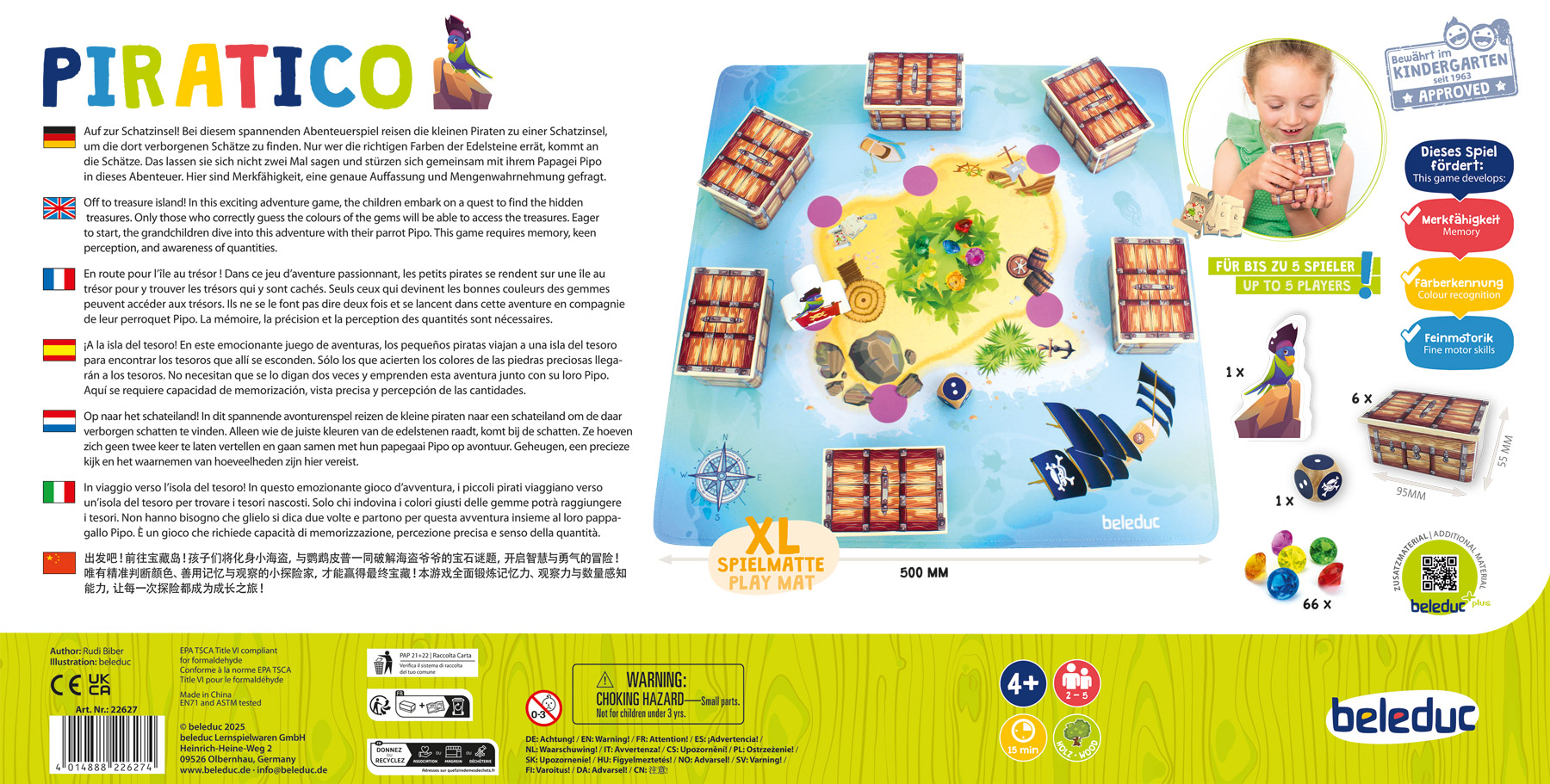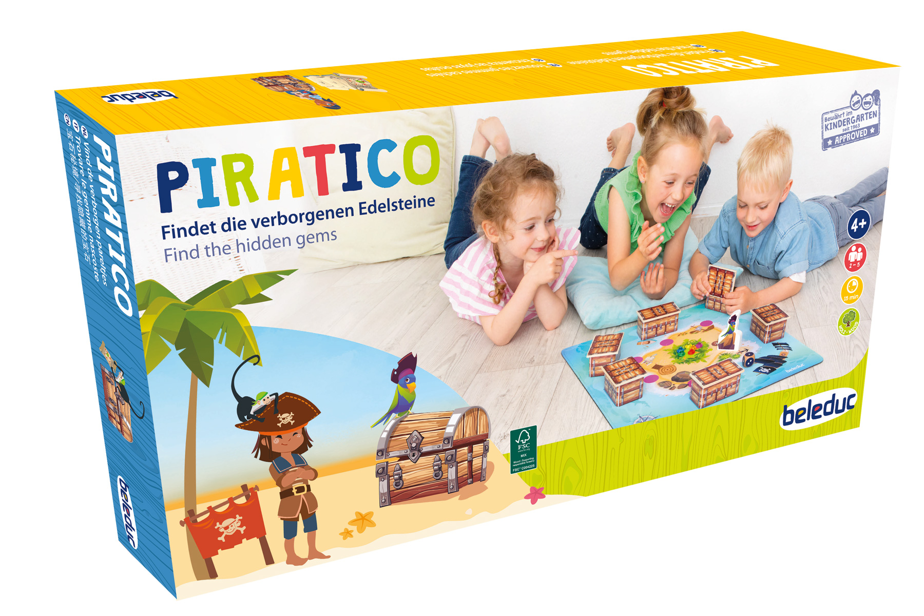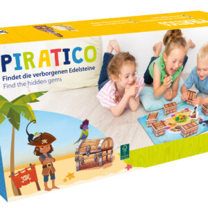 Auf zur Schatzinsel! Bei diesem spannenden Abenteuerspiel reisen die kleinen Piraten zu einer Schatzinsel, um die dort verborgenen Schätze zu finden. Nur wer die richtigen Farben der Edelsteine errät, kommt an die Schätze. Das lassen sie sich nicht zwei Mal sagen und stürzen sich gemeinsam mit ihrem Papagei Pipo in dieses Abenteuer.