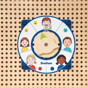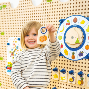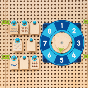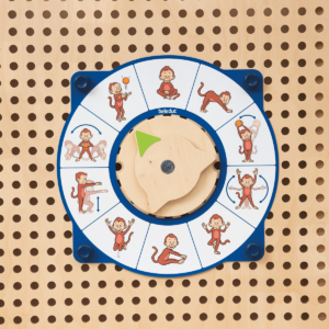 Mit dem PLUG it „Uhr & Aktionsfolien Set“ kommen gleich fünf Spielmöglichkeiten an die PLUG it Wand und ans Spielhaus: Zwei Memo-Spiele mit Früchten und Tieren, ein Bewegungsspiel für Turn- und Yoga-Übungen für die ganze Gruppe, ein Kommunikation-Spiel über unsere Emotionen und eine Uhr mit Holzzeiger zum ersten Strukturieren des Tages. Der Clou: Zwei Spiele können immer gleichzeitig gespielt werden, da es zwei Holz-Drehscheiben gibt.