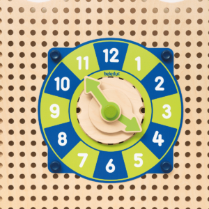 Uhr mit Holzzeiger und Ziffernblatt-Folie: Erstes Uhrenlesen lernen. Besprechen Sie mit den Kindern den Tagesablauf. Wann ist der Morgenkreis, wann gibt es Mittagessen? DIY-Tipp: basteln Sie mit den Kindern Kärtchen mit Bildern der jeweiligen Tagesaktionen. Diese lassen sich mit den Plugs rund um die Uhr befestigen.