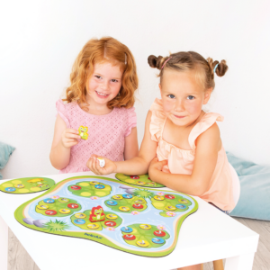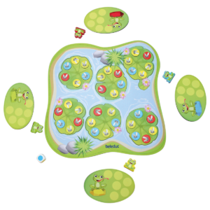 Auf dem Seerosenteich ist einiges los! Dieses spannende und abwechslungsreiche Spiel erfordert eine gute Merkfähigkeit. Die Spieler müssen versuchen so viele Fliegen wie möglich – mithilfe der magnetischen Frösche – zu schnappen und auf der eigenen Spielmatte zu sammeln. Ziel des Spiels ist es, als erster alle Fliegenfelder auf der eigenen Frosch-Spielmatte zu besetzen.