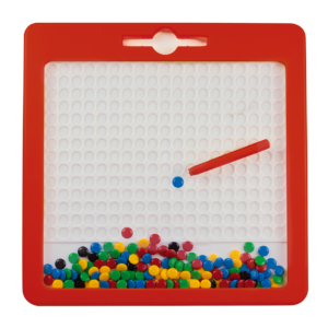 … Ein bis zwei Kinder können das Spielbrett in Regenbogenform mit den bunten Holzkugeln befüllen oder farbige Muster legen. Dazu können die Finger oder zwei Holzpinzetten verwendet werden – in jedem Fall schult das Greifen und Ablegen die Feinmotorik sowie Hand-Auge-Koordination.