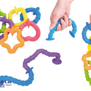 Die bunten, dehnbaren Silikonformen mit Saugnäpfen animieren Kinder zu spielerischen Experimenten: miteinander verketten, testen auf welchen Oberflächen die Saugnäpfe halten … und laut schnalzend wieder lösen.