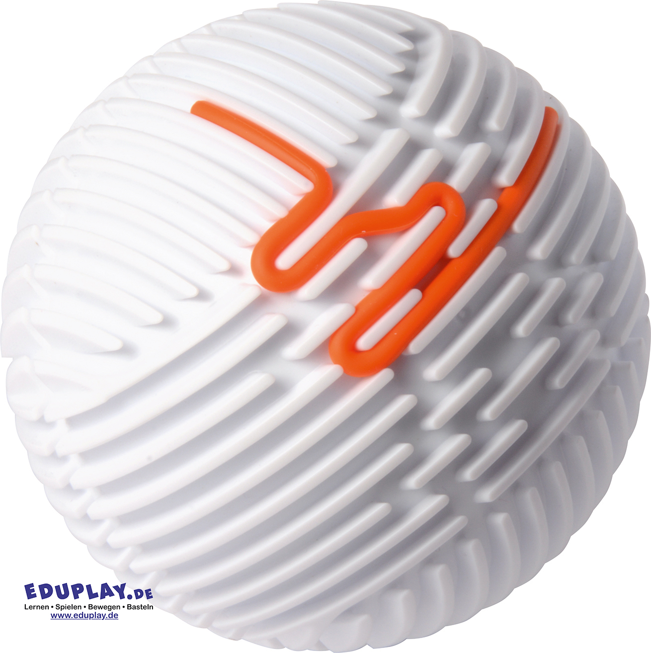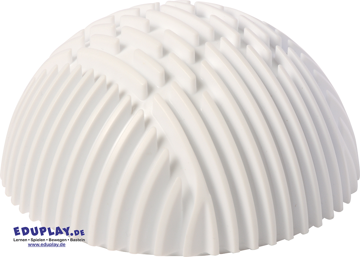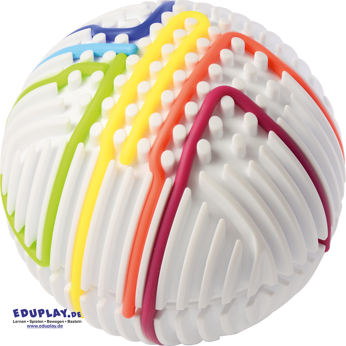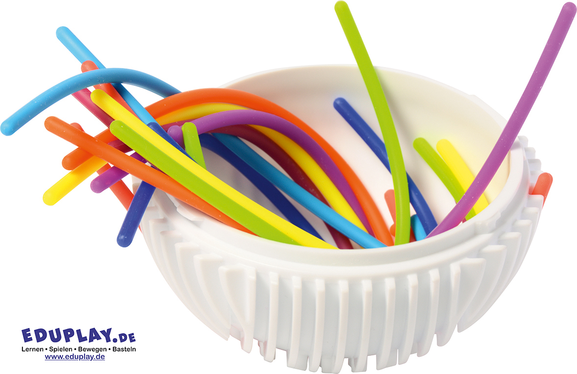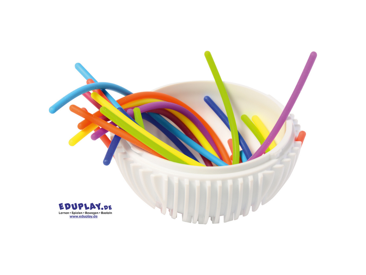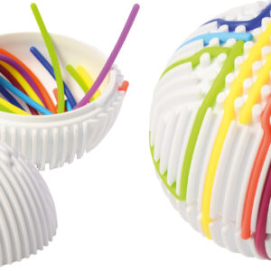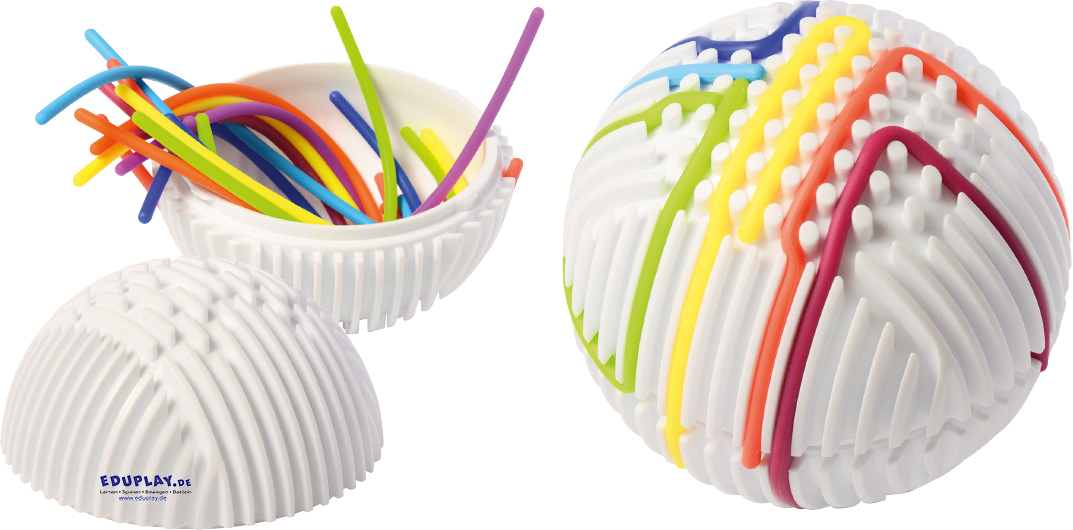 … Die Oberfläche des Balls ist wie ein Labyrinth mit vielen vertieften Rillen gestaltet. Kinder können die beiliegenden 15 Gummischnüre in die Vertiefungen drücken und so immer neue Muster und Wege gestalten. Dabei werden spielerisch die Feinmotorik, Konzentration und taktile Wahrnehmung gefördert.