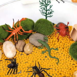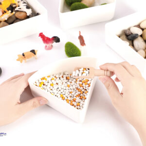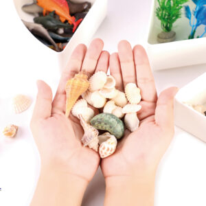 Mit Steinen in verschiedenen Größen, Tieren, Pflanzen und künstlichem Moos können Kinder in der großen transparenten Schale oder auf dem Deckel eine eigene Welt kreieren. Die Materialien mit verschiedensten Oberflächen, Formen und Farben regen beim Spielen, Betrachten und Erforschen den Tastsinn an und fördern die kognitiven Fähigkeiten. Die pädagogisch wertvollen Sensorik-Kästen können zudem kombiniert werden: auf einem Leuchttisch mit Farbwechselspiel oder indem die Themen-Schale Meer mit Wasser gefüllt wird. Das Set enthält eine große, transparente Schale mit fünf dreieckigen Schalen, in denen die Materialien sortiert sind. Der große transparente Deckel verschließt das Set – er kann auch zum Spielen und Sortieren verwendet werden.