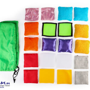 Durch Ertasten und Fühlen zwei gleiche Säckchen zu finden fördert die Sinneswahrnehmung der Kinder. Die 10 x 2 Säckchen haben verschiedene Farben, sind aus unterschiedlichen Oberflächenmaterialien, mit diversen Füllungen, mal stärker und mal flach und je nach Füllung unterschiedlich schwer. Die Säckchen können auch für Wurfspiele oder zum Kneten in den Händen verwendet werden. Inkl. Zugbeutel zur Aufbewahrung.