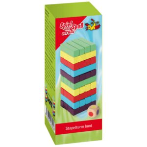Geschicklichkeitsspiel mit 40 bunten Holzstäben und neuer Würfel-Variante. Der Turm wird in Lagen von je vier Stäbchen, abwechselnd längs- und quer ausgerichtet, aufgebaut. Reihum ziehen nun die Mitspieler ein Stäbchen aus dem Turm und setzen es vorsichtig in der vorgegebenen Richtung auf den Stapel. Sieger ist, wer als letztes ein Stäbchen auf den Turm setzen kann, ohne dass er einstürzt. Spielvariante mit Farbwürfel: Mit dem Farbwürfel wird jeweils bestimmt, welche Farbe der Spieler ziehen darf.