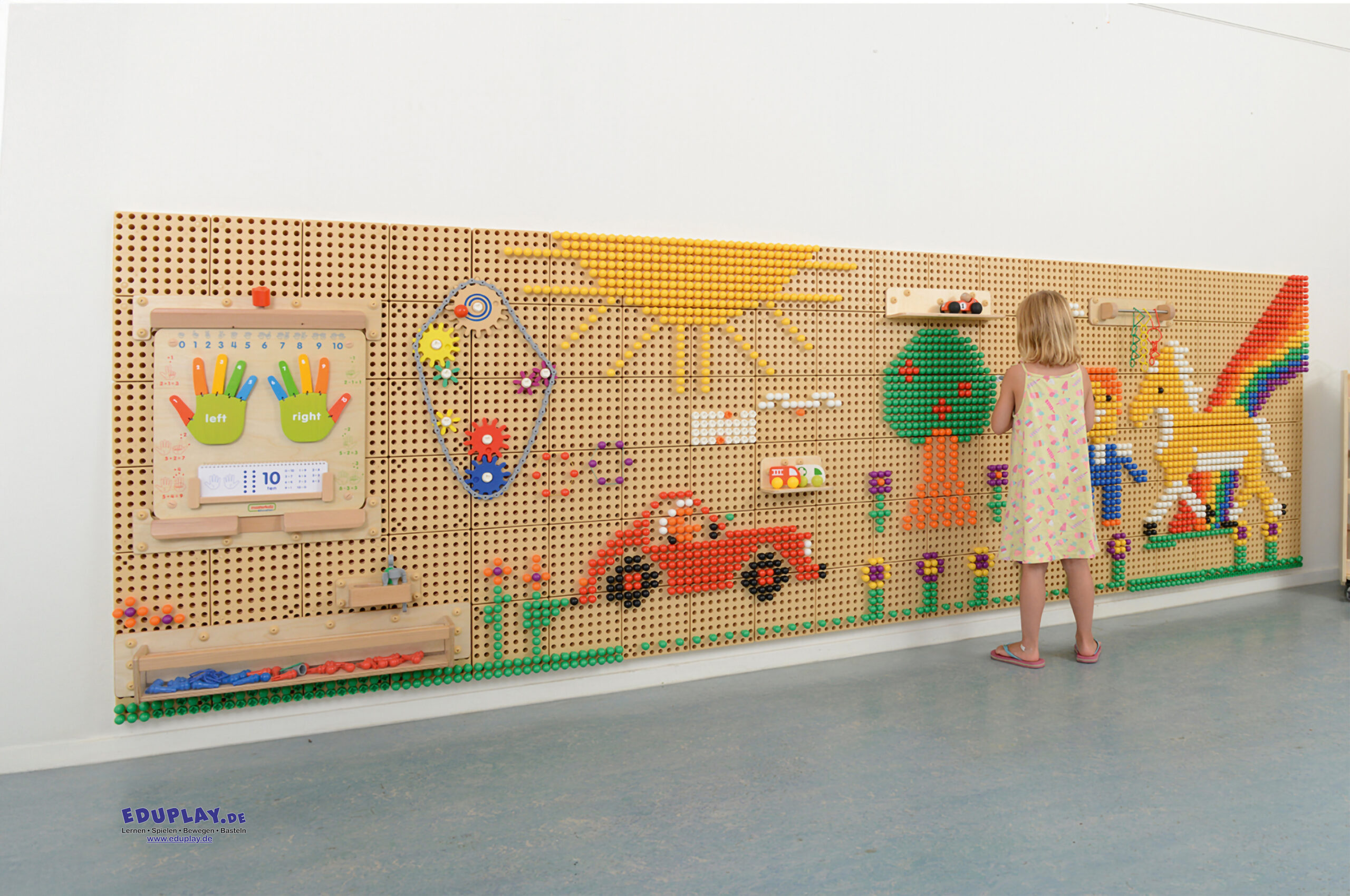 … Die Systemwand ist eine vielseitige Spiel- und Lernwand, die Kinder zum Experimentieren, Konstruieren und Entdecken einlädt. Die robuste Kunststoffplatte mit präzisen Lochmustern lässt sich flexibel an der Wand anbringen und beliebig erweitern. Ein vielseitiges System, das mitwächst und jeden Tag neue Impulse für forschendes Lernen bietet. Inkl. Schrauben und Verbinder.