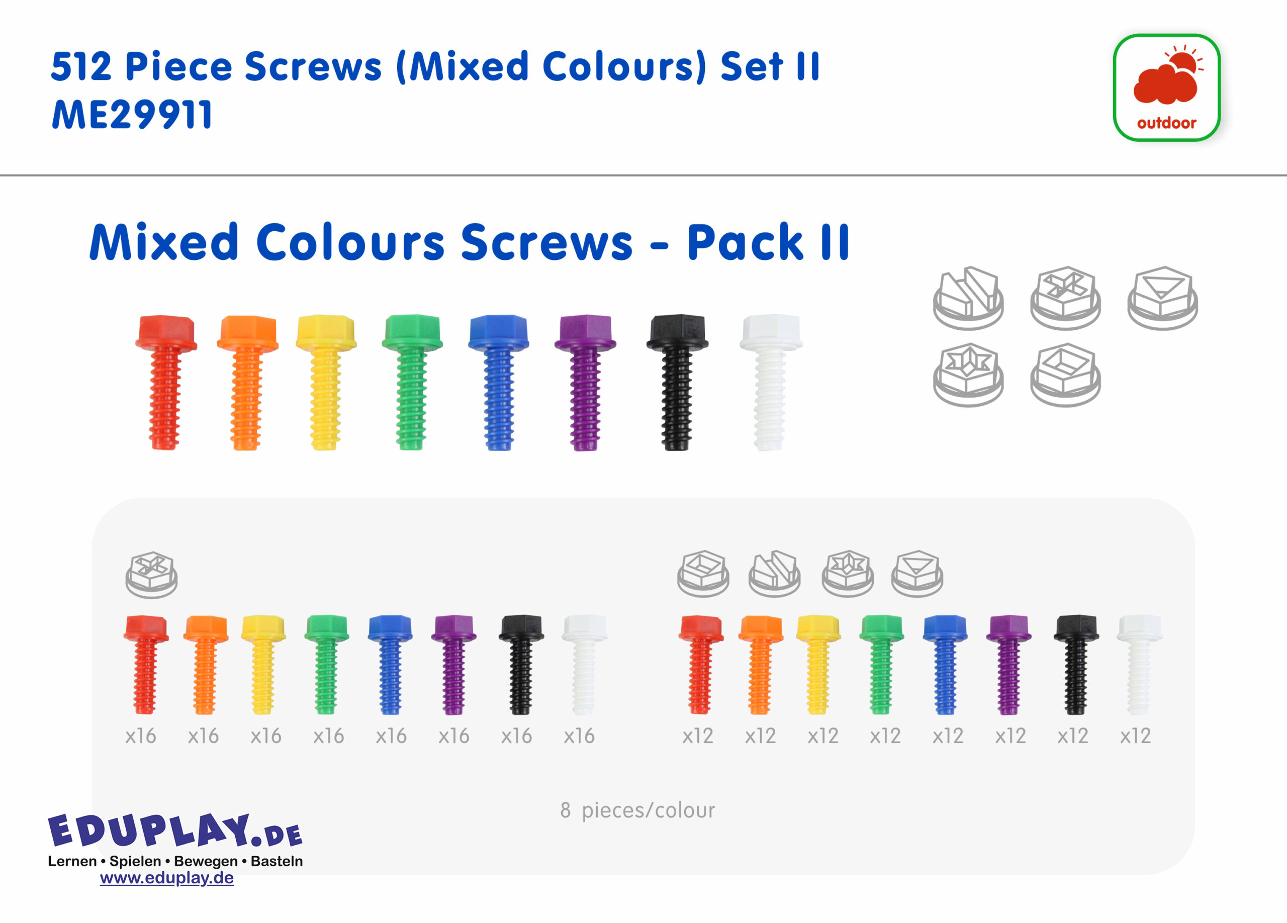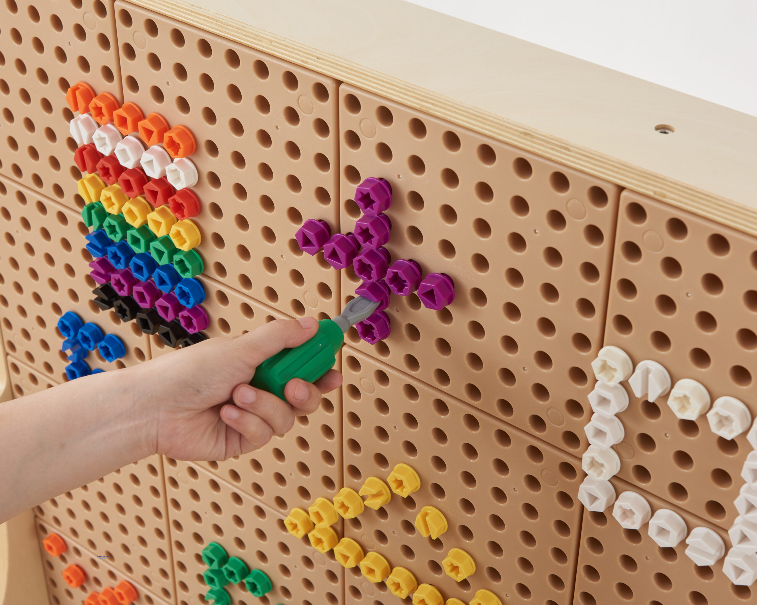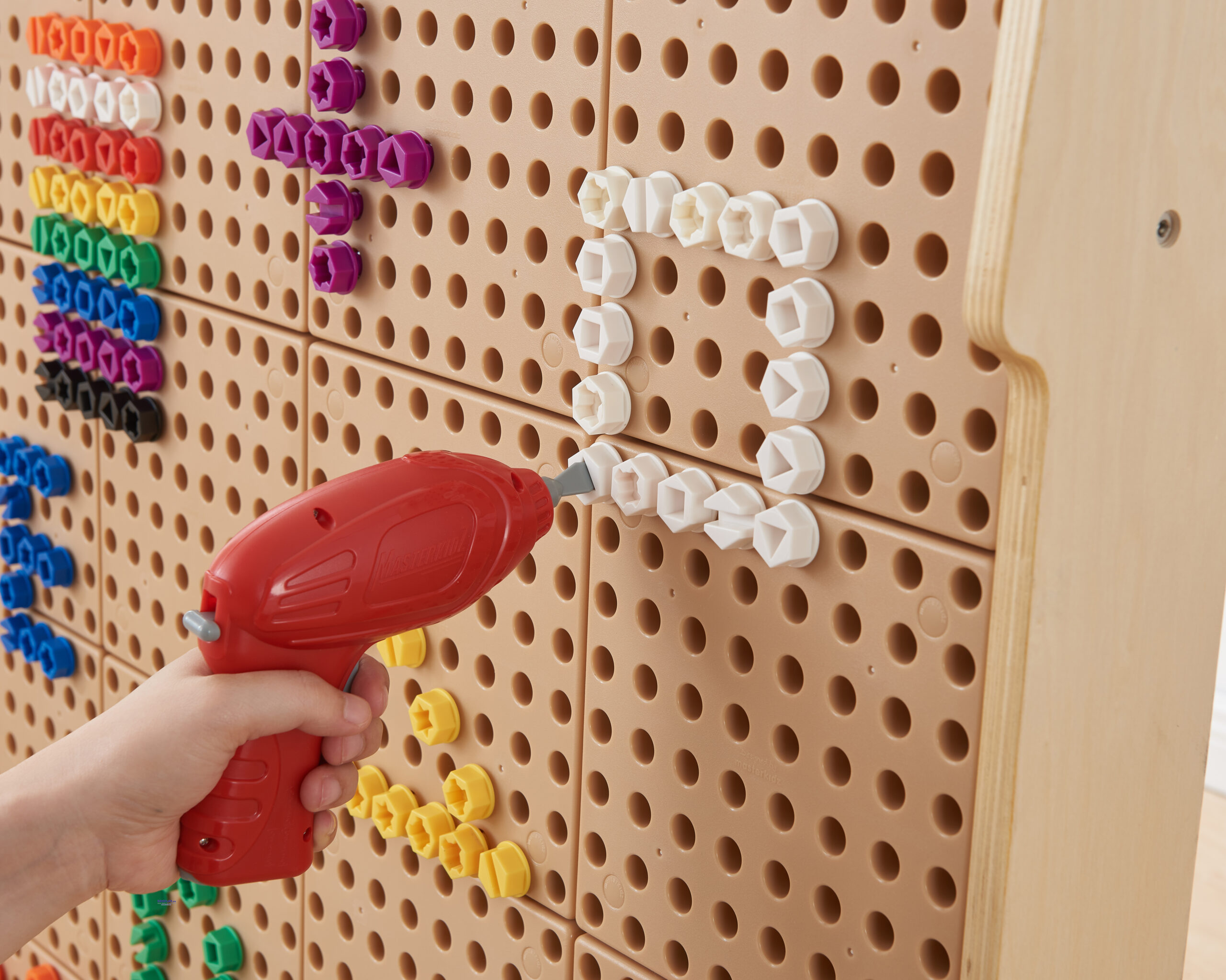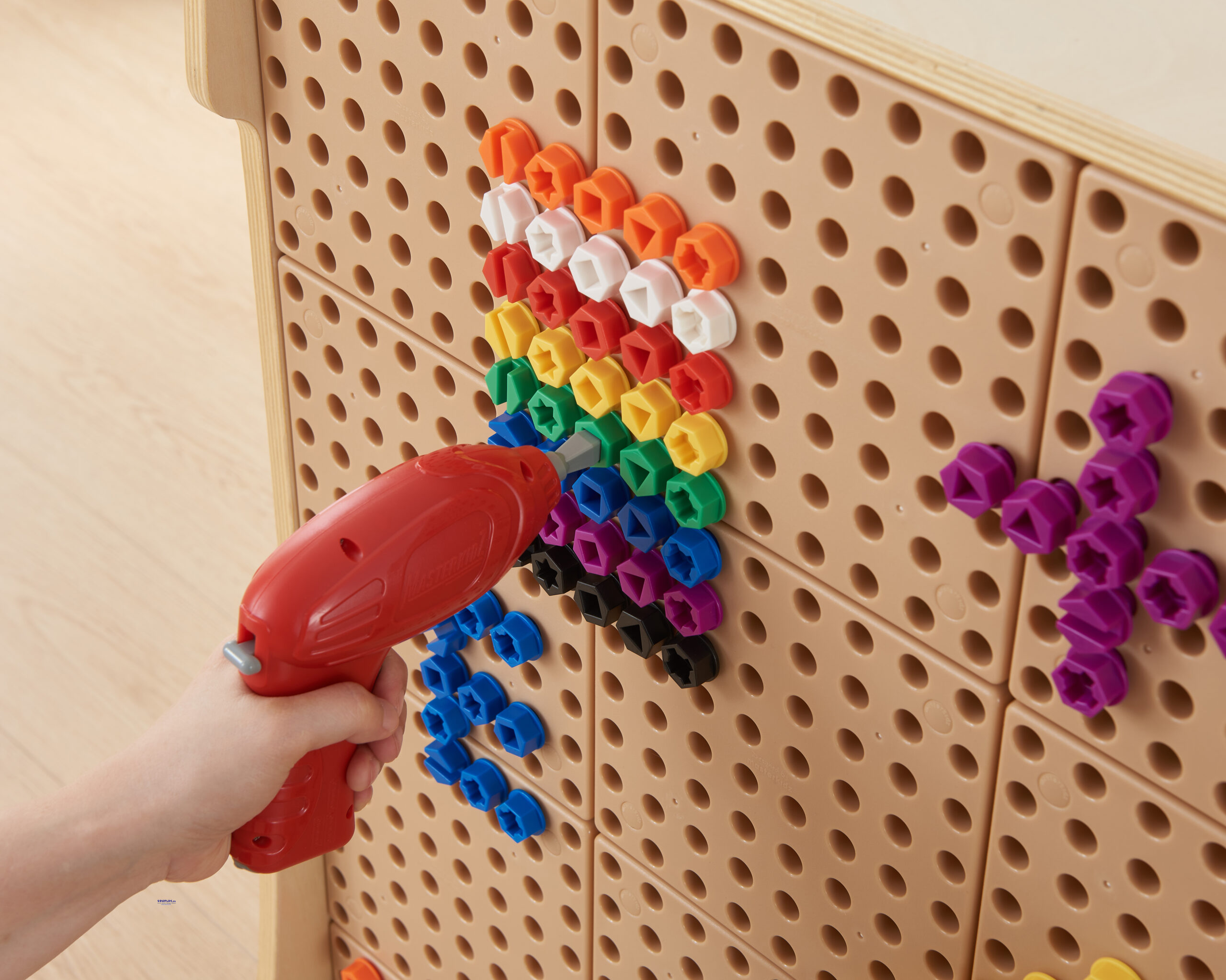 können Kinder Bilder, Muster oder Abfolgen bauen, indem sie mit einem elektrischen Schraubendreher schnell und einfach verschiedenfarbige Schrauben in jede STEM-Wand oder jeden STEM-Tisch einschrauben. Was dieses Set jedoch noch interessanter macht, sind die 8 verschiedenfarbigen Schrauben mit 5 verschiedenen Schraubenkopfdesigns, die zu verschiedenen Schraubendreherprofilen passen. Die Kinder müssen den richtigen Schraubendrehereinsatz für den Schraubenkopf auswählen. Dabei müssen die Kinder über das gewünschte Design nachdenken, die richtige farbige Schraube und den richtigen Schraubendrehereinsatz für den Schraubenkopf auswählen und diese dann an der richtigen Stelle festschrauben. Das Set fördert das gestalterische Denken, das Erstellen von Mustern, die Zuordnung, die Hand-Augen-Koordination, die Auswahl des richtigen Werkzeugs für den Schraubenkopf und das Befestigen mit einem echten, funktionierenden Elektroschrauber. Das ist praktisches MINT-Lernen in Aktion!