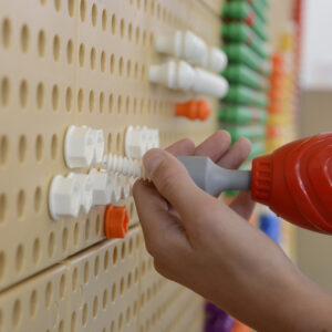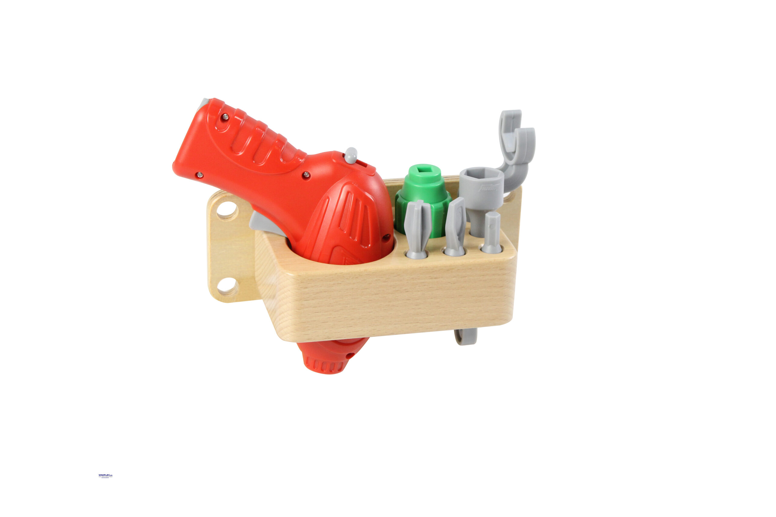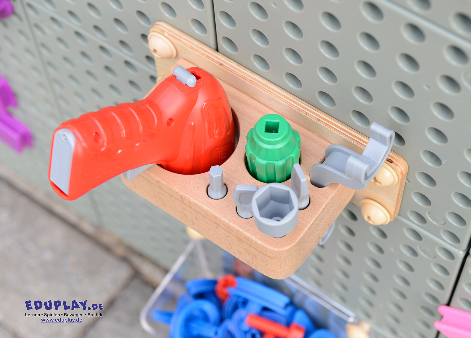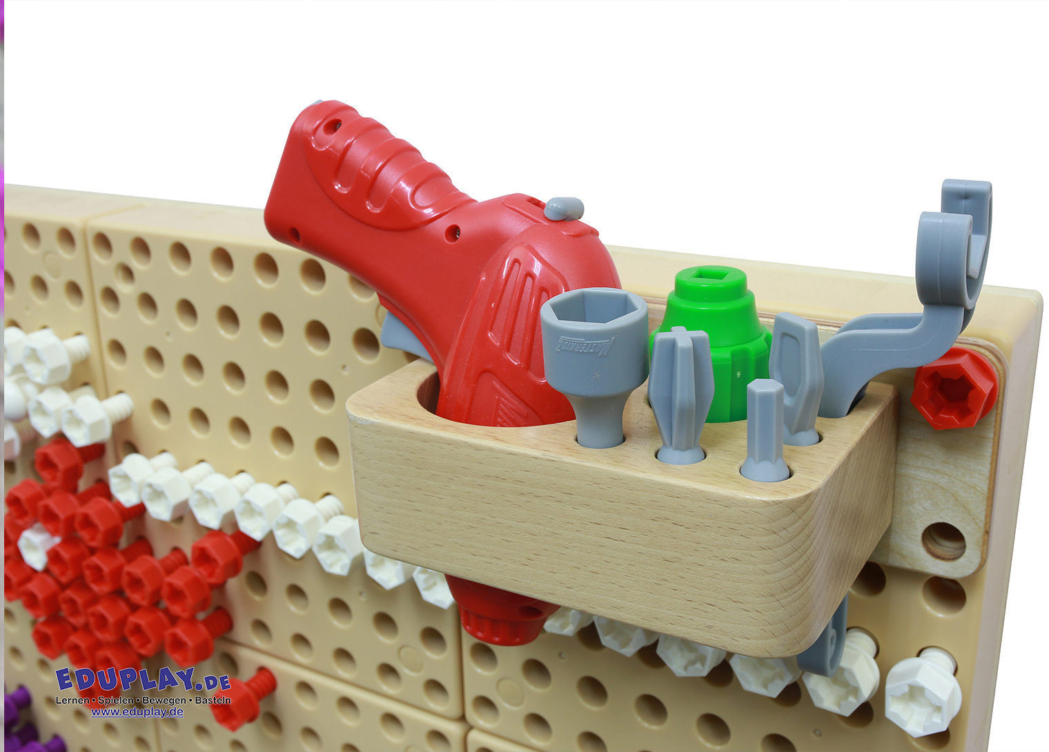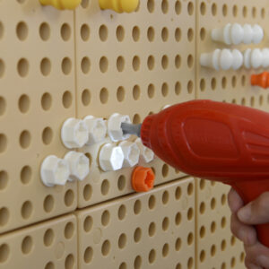 und dieses Set bietet Kindern die Möglichkeit, ein echtes batteriebetriebenes Handwerkzeug zu benutzen. Es ist ergonomisch geformt, passt gut in Kinderhände und verfügt über einen Ein-/Aus-Schalter mit Auslöser. Das Handwerkzeug ist sofort einsatzbereit für Kinder ab 3 Jahren. Das Befestigen von Schrauben an der STEM-Wand oder am Tisch wird noch einfacher, macht aber mehr Spaß und ist spannender. Das Set enthält Handwerkzeuge, einen batteriebetriebenen Schrauber und einen Werkzeugorganizer aus Buchenholz, der an die STEM-Wand befestigt werden kann.