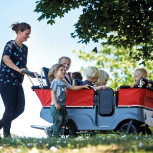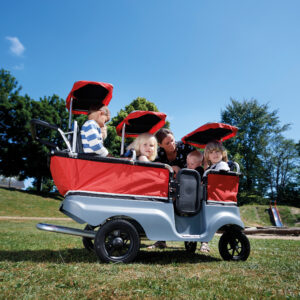 Die Turtle Kinderbusse sind optimale Transportfahrzeuge für mehrere Kinder, sie erleichtern alle Draußen-Aktivitäten und bieten Sicherheit für die Kinder und die Erwachsenen. Jeder Turtle Kinderbus überzeugt mit durchdachtem Design, das Sicherheit, Haltbarkeit und Ergonomie fokussiert und viele praktische Details bietet, wobei das Kind immer im Vordergrund steht. Für Kinderkrippen, Kindergärten, Tagesmütter und andere Kinder-Institutionen. Für Aktivitäten in Freizeit- und Themenparks, in zoologischen Gärten, Freilandmuseen usw.. Der Turtle Kinderbus ist geeignet für alle befestigen Straßen und Wege. Mit der geringen Breite von nur 75 cm passt der Turtle Kinderbus durch Türen, Kassenschleusen und in Fahrstühle. Die Materialien Kunststoff und Aluminium sorgen trotz der kompakten Form für ein geringes Eigengewicht und machen ihn extrem leichtgängig. Mit den drehbaren Vorderrädern, die jede Richtungsänderung mitmachen, ist er sehr gut zu lenken und muss – auch in Kurven – nicht angehoben werden. Der Kinderbus bremst automatisch, wenn Handgriff und Bremsbügel losgelassen werden. Alle Sitze sind festmontiert und mit 5-Punkt-Festhaltegurten ausgestattet.
