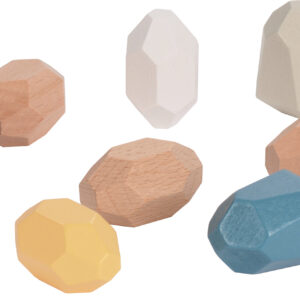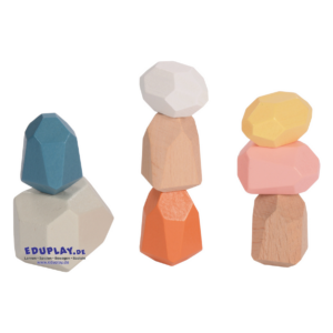 Die Holzbausteine in 6 Varianten machen das Stapeln ein bisschen knifflig. Durch ihre besondere Formgebung mit 18 bzw. 20 Seiten und unterschiedlich großen Auflageflächen können die Steine stehend oder liegend übereinander kombiniert werden … bis der Turm so wackelig ist, dass das Bauwerk einstürzt. Beim Konstruieren sind Köpfchen und Fingerspitzengefühl gefragt.
